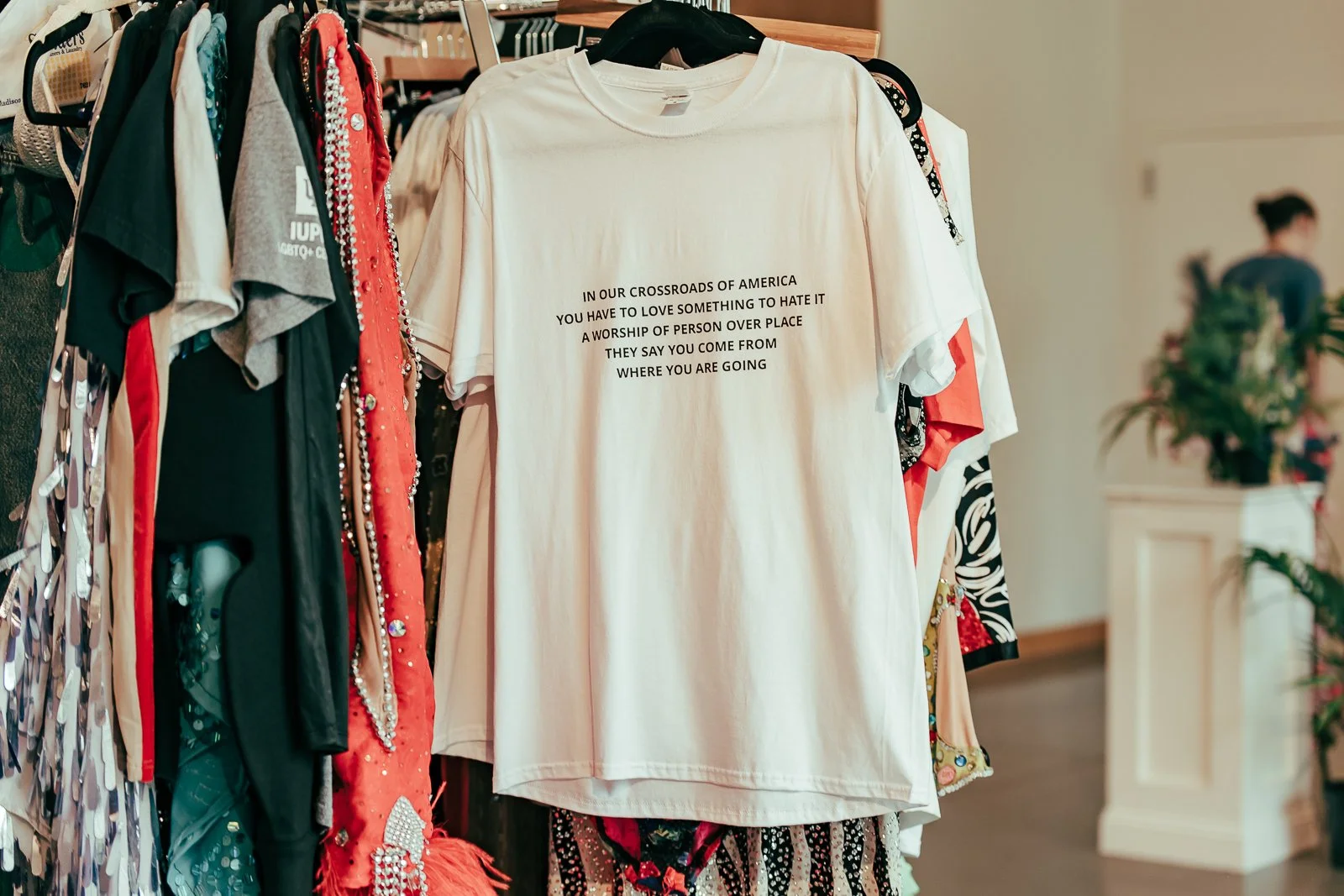 ALL MATERIALS ARE MIRRORS (2024) is a tangible sculpture made of clothing compiled of LGBTQ+ Hoosiers. Throughout the clothes, there are three poems screen-printed on white T-shirts reflecting on the Queer and Trans experience in Indiana in 2024: Small (Self), Medium (Midwest), Large (Land: USA).